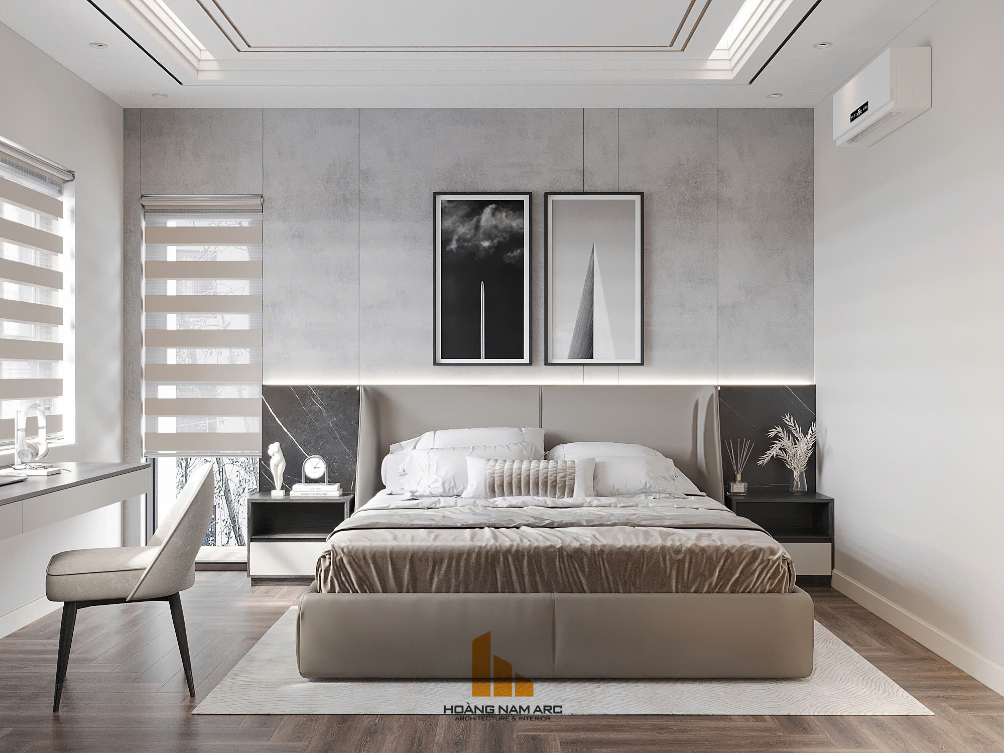 Một không gian phòng ngủ hiện đại mang tone trắng – ghi sáng, thiết kế tối giản nhưng vẫn đầy đủ công năng, đem lại cảm giác thư giãn và